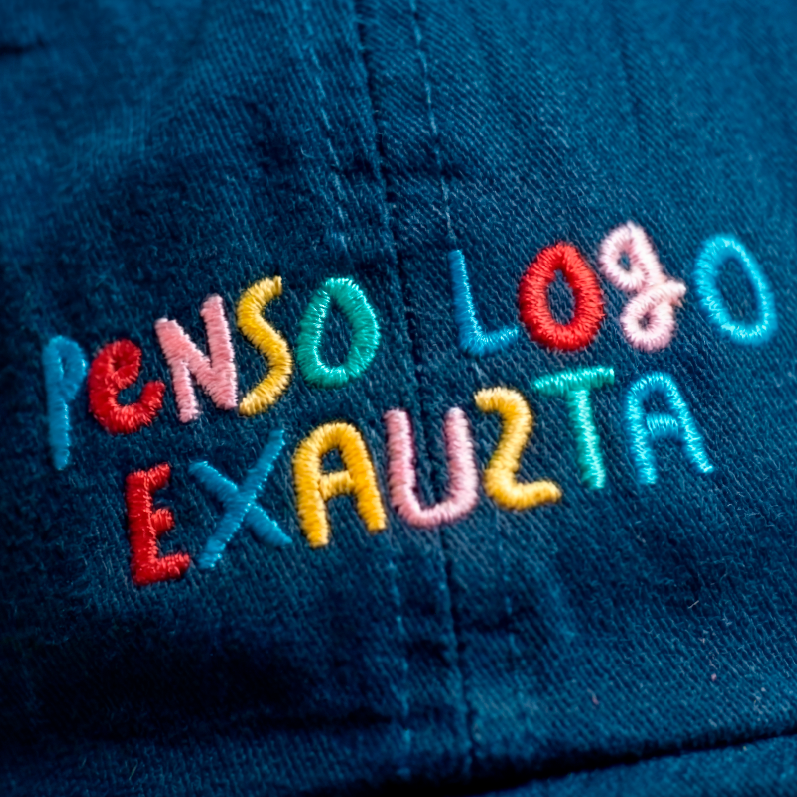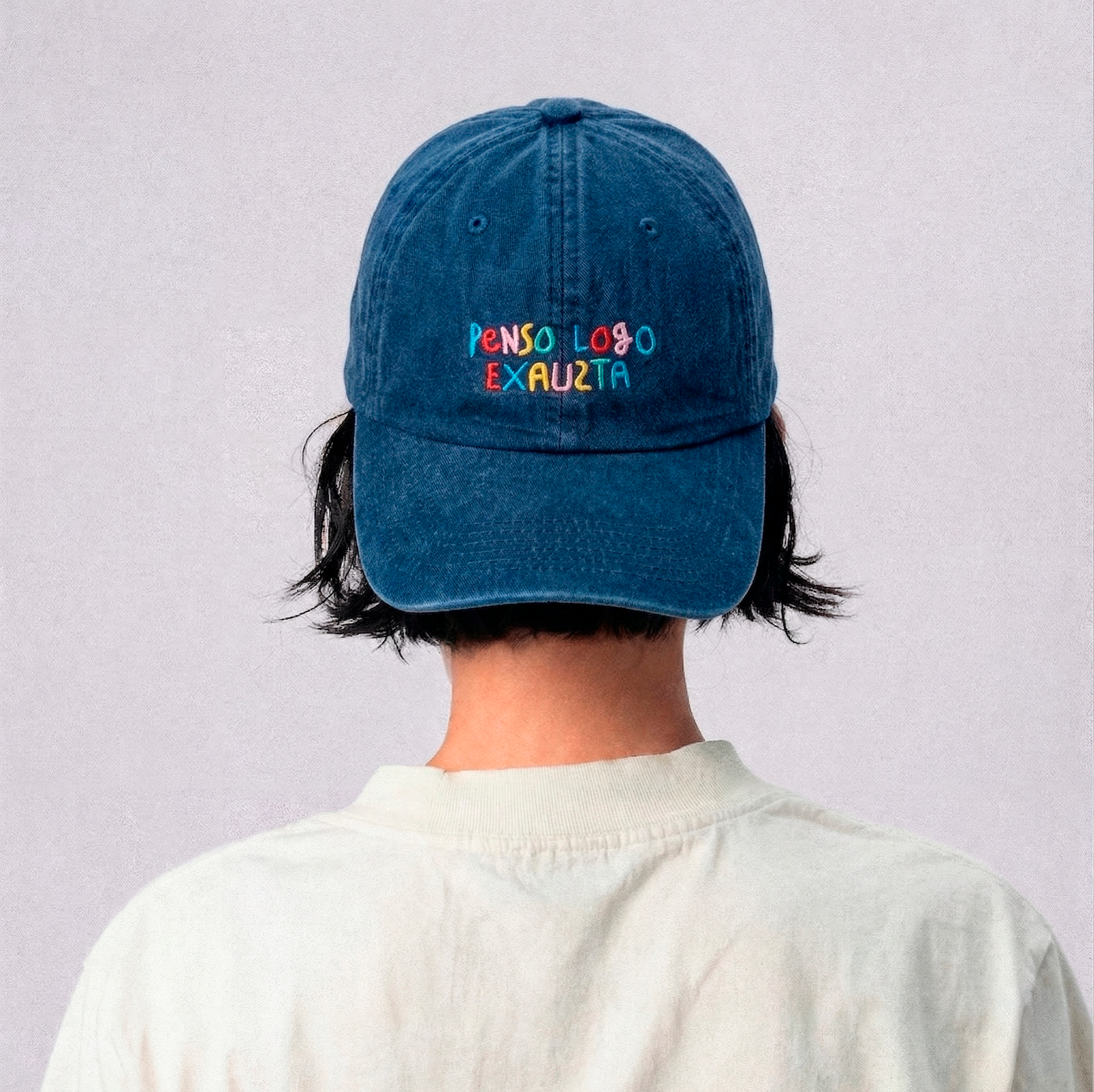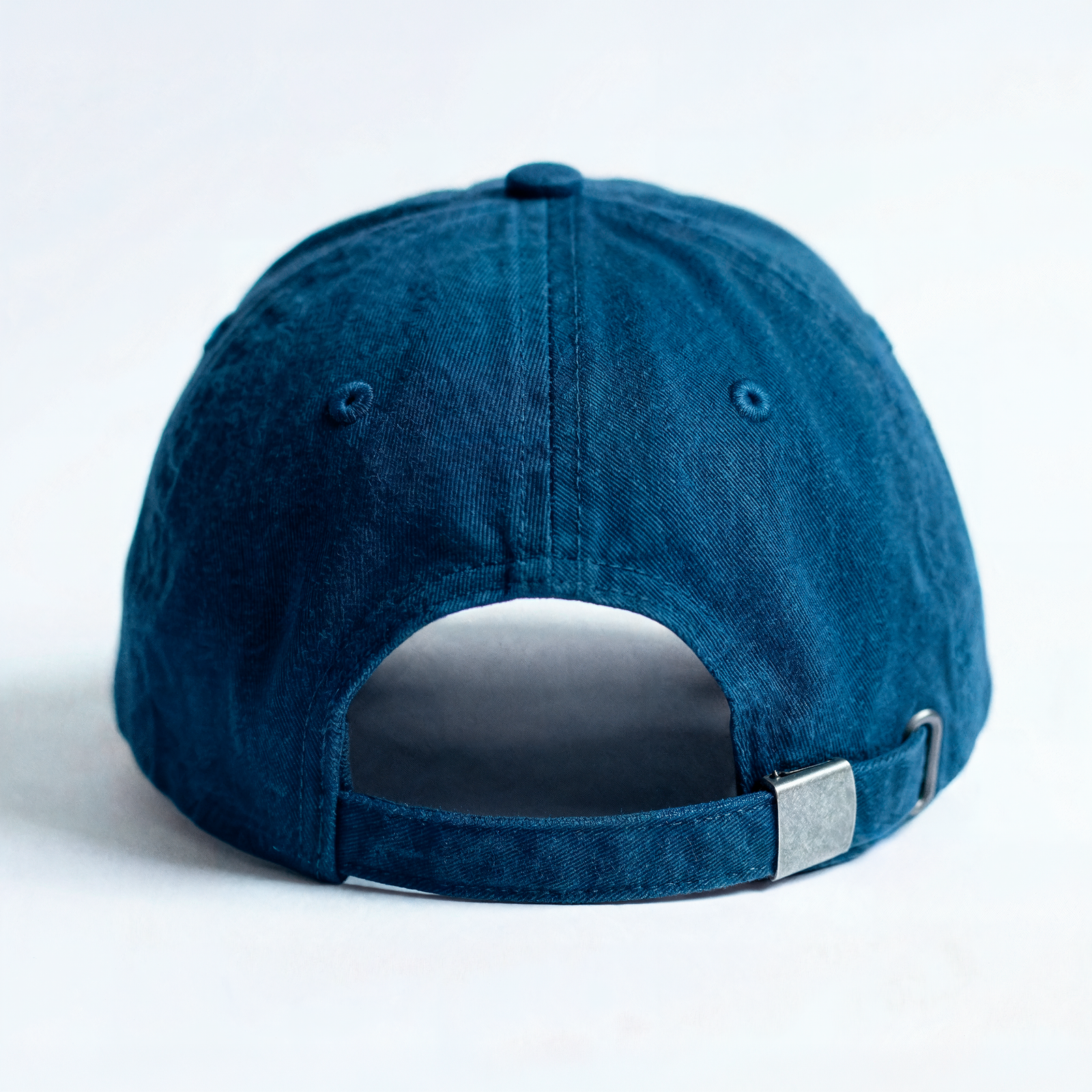 Boné Dad Hat de sarja azul marinho ajustável com fivela de metal e frase bordada.